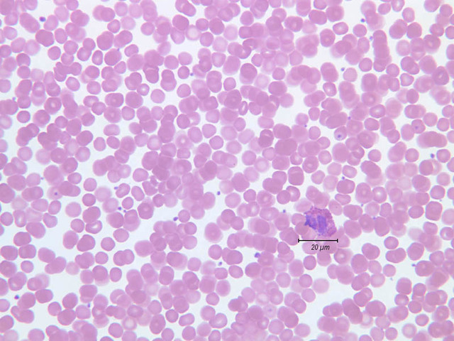 - Reticulocyte (Polychromatophilic Erythrocyte): This cell may not be distinguished by the stain used for your slide. Slightly larger (10 μm) than mature RBC. Nucleus lost. Cytoplasm acidophilic or slightly basophilic. Supravital staining (e.g., Cresyl violet) demonstrates presence of cytoplasmic reticular network of cell organelle remnants, particularly ribosomes. Small numbers can be found in peripheral blood.