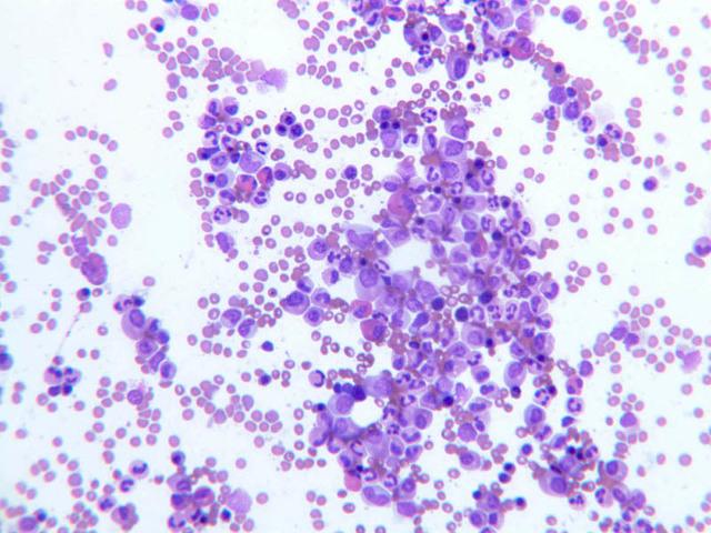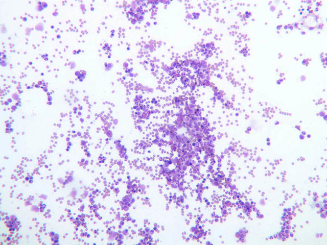 Scan the slide under low power. The most immediately obvious cell type will be