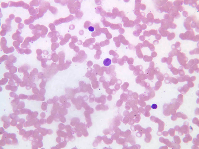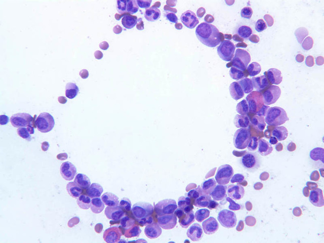 40x-labeled]). These are 7.5μm in diameter and with a very thin rim of bluish cytoplasm surrounding the nucleus. The nucleus is