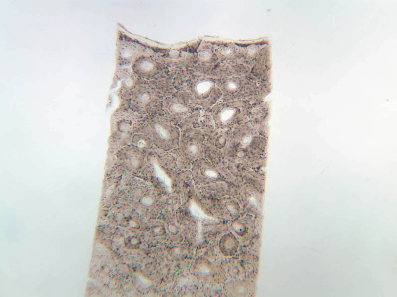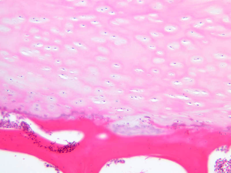 40x-labeled]). This is a section through the knee joint of a rabbit. Can you identify the distal portion of the femur, the patella and the tibia? Some sections may include part of the ankle joint as well. Note that the ends of the bones are still composed of hyaline type cartilage. Try to identify the different zones of cartilage (reserve, proliferating, hypertrophic) as they transition into bone (enchondral ossification).