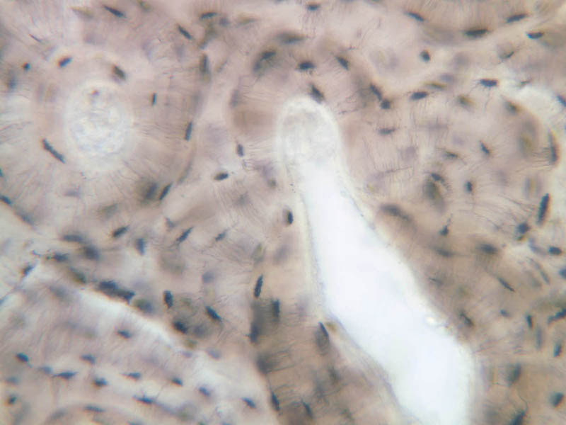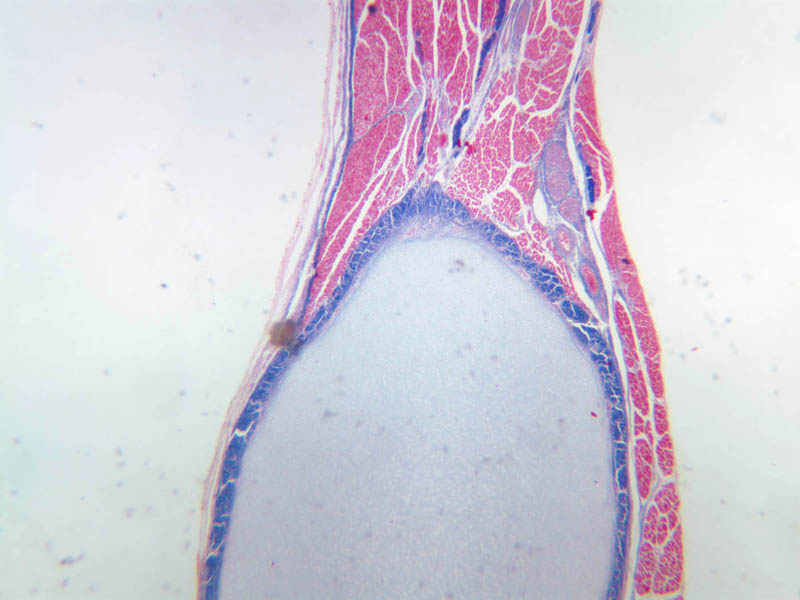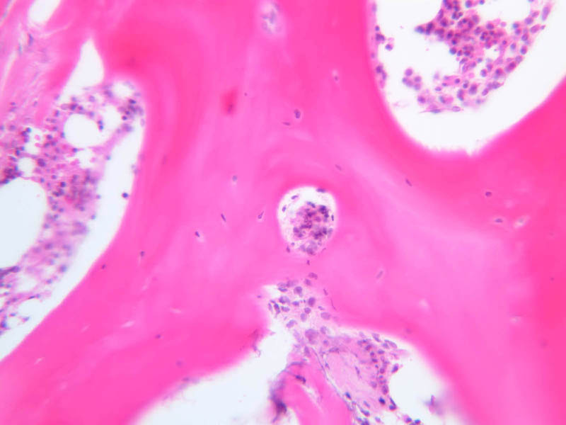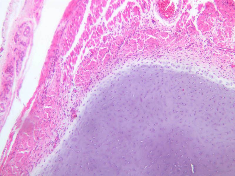 Also note that the cartilaginous end of the femur has a secondary center of ossification in the middle of the cartilage. This proceeds by ingrowth of blood vessels into the cartilage, bringing osteoblasts. Try to identify the blood vessels, new bone, and bone marrow within the center of the cartilage. In humans, this secondary center of ossification appears at the end of bones at various ages; in the proximal femoral head it is present near the time of birth and continues to ossify throughout childhood. The secondary center of ossification of the distal femoral condyle (which is on slide