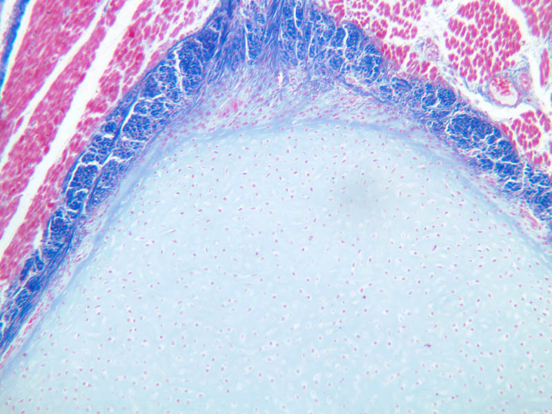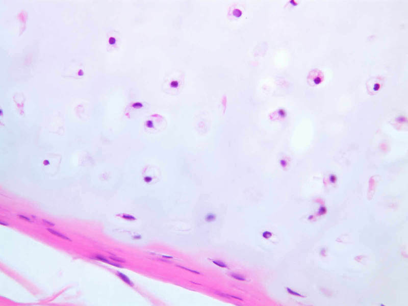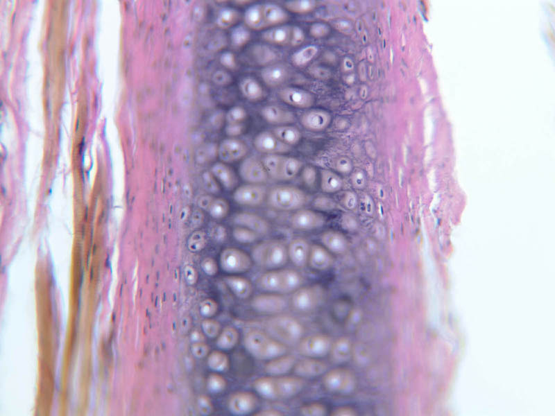 Cells inside the cartilage substance are called chondrocytes; they are enveloped by the semi-solid matrix which appears to be fibrillar. In sections the cells have usually shrunk away slightly from the matrix, exaggerating the lacuna or space in which they lie. Where several cells appear clumped together, they are called cell nests. These nests result from multiplication of chondrocytes which have thereafter been unable to move apart. Scanning the section will show that the matrix has differences in coloration from one place to another, reflecting differences in chemical constitution.
