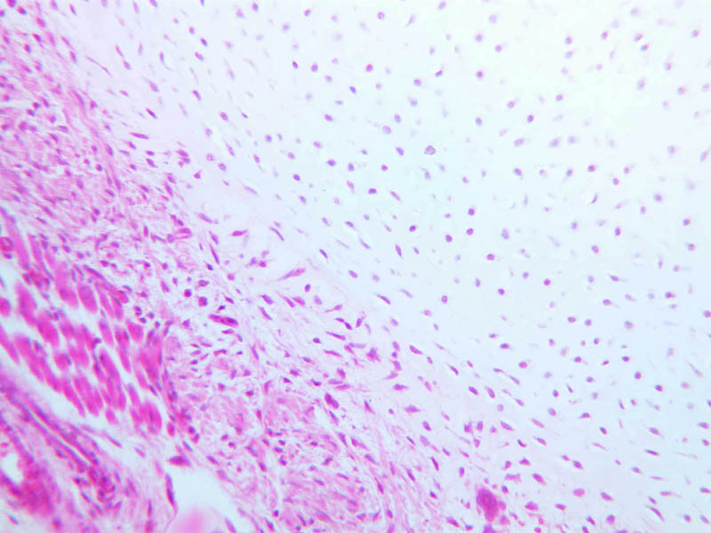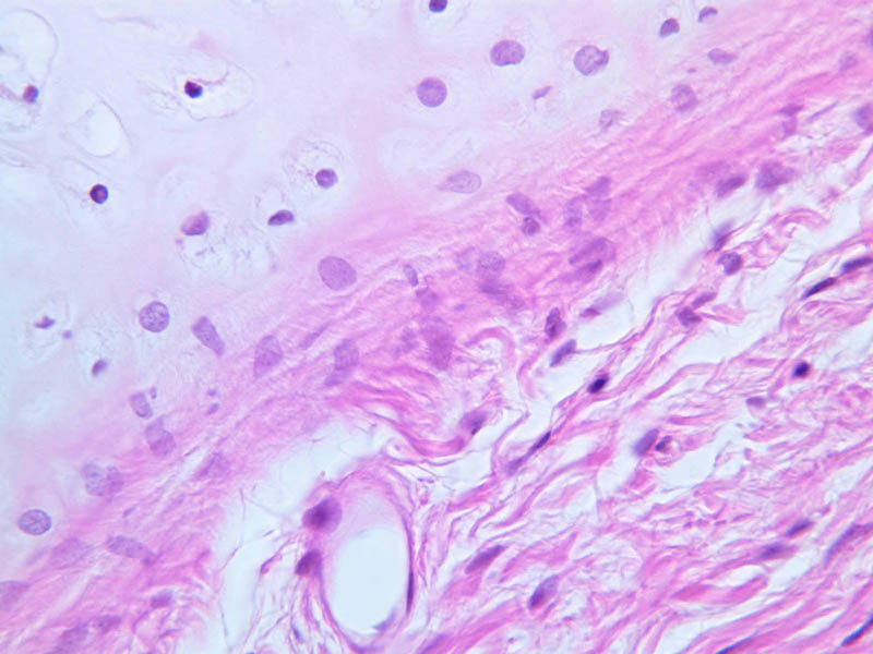 40x]). The synovium is lined by two kinds of cells – secretory and phagocytic, although these are not easily distinguished from one another. You should be able to identify the synovium within the joint space, and see the lining, which covers the loose fibrous-vascular network underneath. The synovium is important in producing synovial fluid, which lubricates the joint; synovial fluid also nourishes the cartilage, which in adults is completely avascular. The knee joint is a complicated joint, which allows movement in several planes. In addition to the fibrous capsule, there are additional ligaments between the bones, adding to flexibility and stability of the structure as a whole.