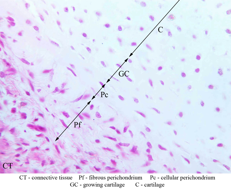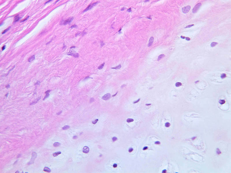 40x]). Cartilage grows when cells (chondroblasts) within this membrane deposit new ground substance. The perichondrium is also the means by which ligaments and tendons are attached to the cartilage.