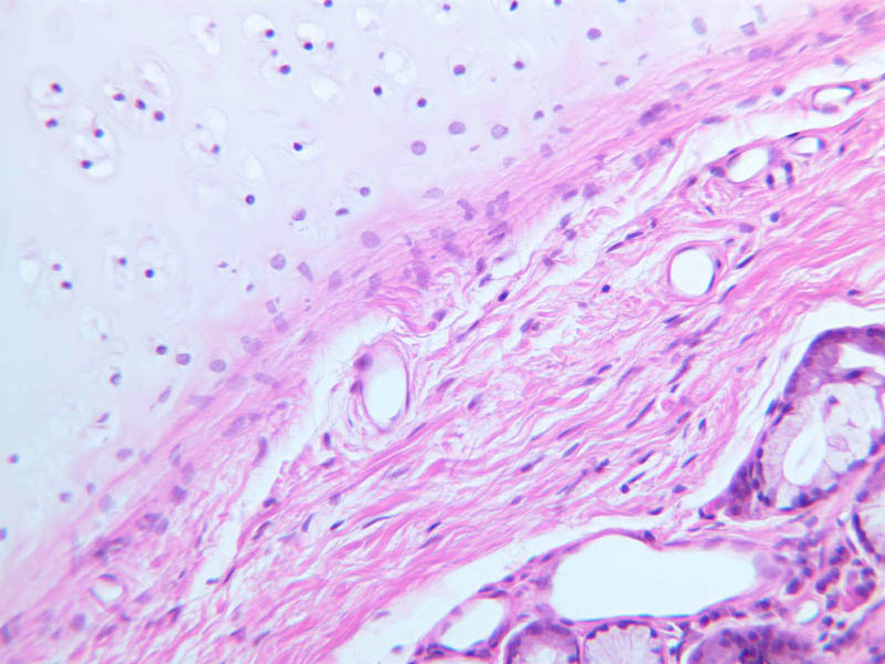 40x]). The ring of cartilage is bound on its inner and outer sides by a dense fibro-cellular membrane called perichondrium. The perichondrium has an outer fibrous and inner chondrogenic (cellular) layer. These layers are discernable when cartilage is actively growing (A-6, infant costal cartilage, H&E [