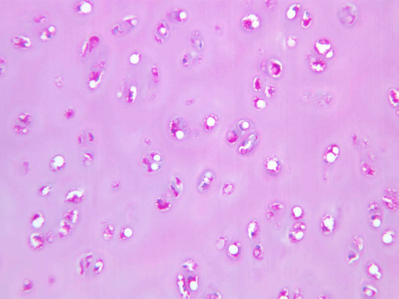 Cells inside the cartilage substance are called chondrocytes; they are enveloped by the semi-solid matrix which appears to be fibrillar. In sections the cells have usually shrunk away slightly from the matrix, exaggerating the lacuna or space in which they lie. Where several cells appear clumped together, they are called cell nests. These nests result from multiplication of chondrocytes which have thereafter been unable to move apart. Scanning the section will show that the matrix has differences in coloration from one place to another, reflecting differences in chemical constitution.