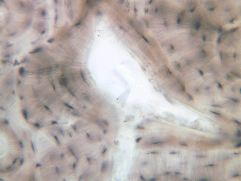 Also note that the cartilaginous end of the femur has a secondary center of ossification in the middle of the cartilage. This proceeds by ingrowth of blood vessels into the cartilage, bringing osteoblasts. Try to identify the blood vessels, new bone, and bone marrow within the center of the cartilage. In humans, this secondary center of ossification appears at the end of bones at various ages; in the proximal femoral head it is present near the time of birth and continues to ossify throughout childhood. The secondary center of ossification of the distal femoral condyle (which is on slide