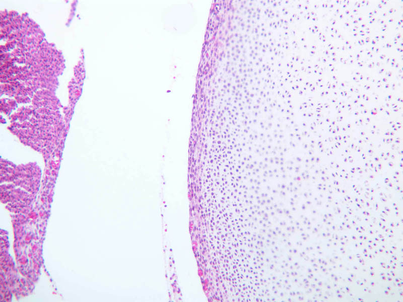 40x-labeled]). This is a section through the knee joint of a rabbit. Can you identify the distal portion of the femur, the patella and the tibia? Some sections may include part of the ankle joint as well. Note that the ends of the bones are still composed of hyaline type cartilage. Try to identify the different zones of cartilage (reserve, proliferating, hypertrophic) as they transition into bone (enchondral ossification).