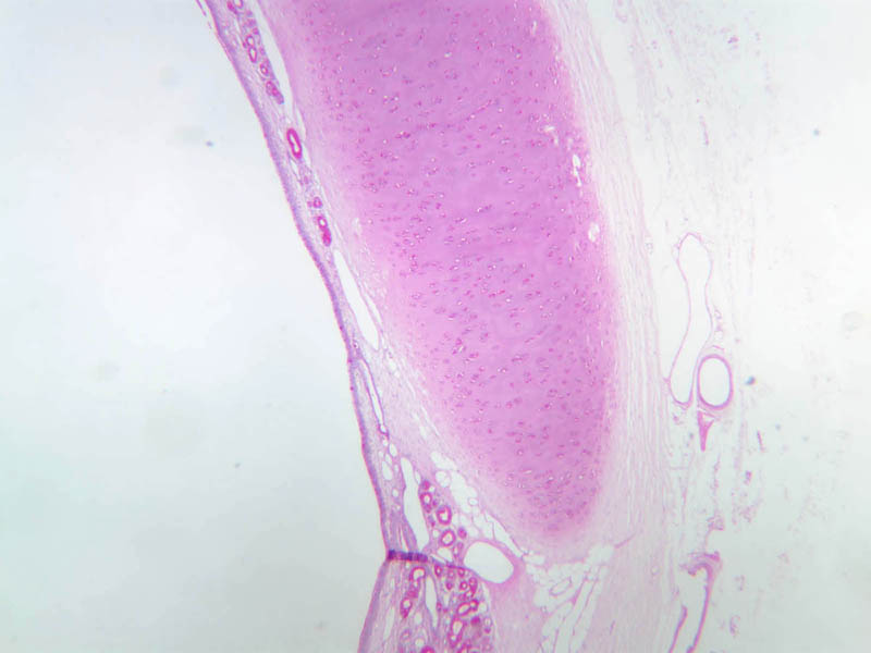 Cells inside the cartilage substance are called chondrocytes; they are enveloped by the semi-solid matrix which appears to be fibrillar. In sections the cells have usually shrunk away slightly from the matrix, exaggerating the lacuna or space in which they lie. Where several cells appear clumped together, they are called cell nests. These nests result from multiplication of chondrocytes which have thereafter been unable to move apart. Scanning the section will show that the matrix has differences in coloration from one place to another, reflecting differences in chemical constitution.