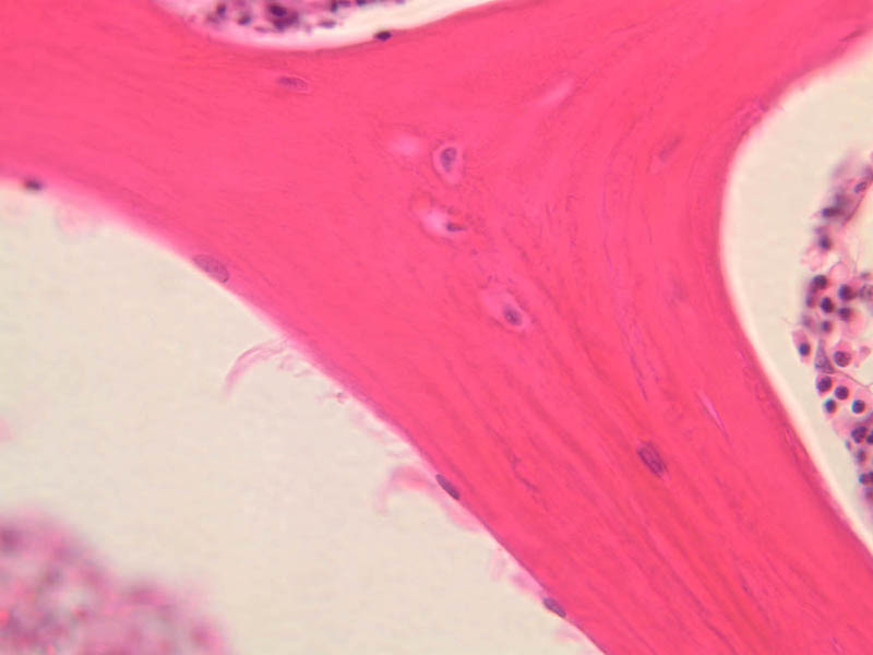 Also note that the cartilaginous end of the femur has a secondary center of ossification in the middle of the cartilage. This proceeds by ingrowth of blood vessels into the cartilage, bringing osteoblasts. Try to identify the blood vessels, new bone, and bone marrow within the center of the cartilage. In humans, this secondary center of ossification appears at the end of bones at various ages; in the proximal femoral head it is present near the time of birth and continues to ossify throughout childhood. The secondary center of ossification of the distal femoral condyle (which is on slide