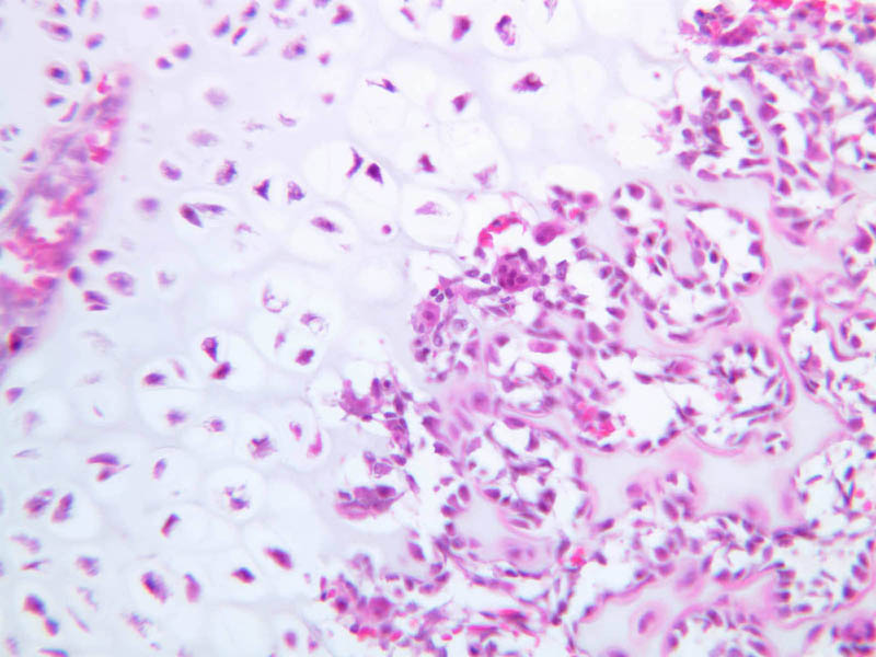 Also note that the cartilaginous end of the femur has a secondary center of ossification in the middle of the cartilage. This proceeds by ingrowth of blood vessels into the cartilage, bringing osteoblasts. Try to identify the blood vessels, new bone, and bone marrow within the center of the cartilage. In humans, this secondary center of ossification appears at the end of bones at various ages; in the proximal femoral head it is present near the time of birth and continues to ossify throughout childhood. The secondary center of ossification of the distal femoral condyle (which is on slide