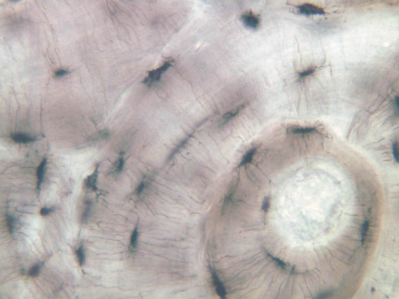 Also note that the cartilaginous end of the femur has a secondary center of ossification in the middle of the cartilage. This proceeds by ingrowth of blood vessels into the cartilage, bringing osteoblasts. Try to identify the blood vessels, new bone, and bone marrow within the center of the cartilage. In humans, this secondary center of ossification appears at the end of bones at various ages; in the proximal femoral head it is present near the time of birth and continues to ossify throughout childhood. The secondary center of ossification of the distal femoral condyle (which is on slide