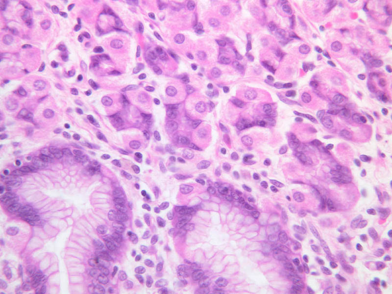 The chief or zymogenic cells have a rather granular, basophilic cytoplasm and produce pepsinogen, which, upon encountering the acidic gastric juice, is converted into the proteolytic enzyme pepsin. As the name suggests, the chief cells are usually the most numerous cell type in the glands of the fundic region.