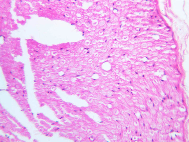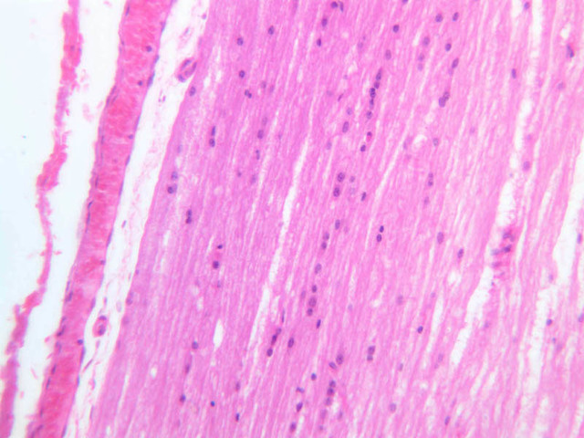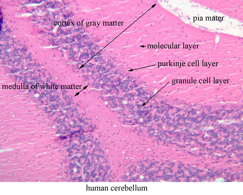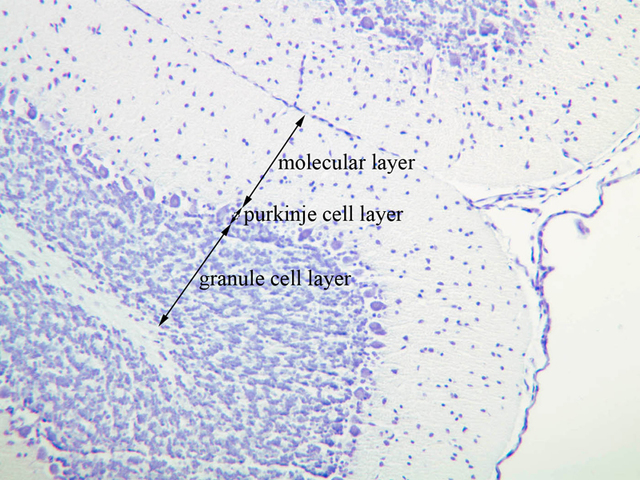 round blue-staining nuclei of very small neurons - the granule cells. The pink-staining band next to the surface contains few nuclei and is called the