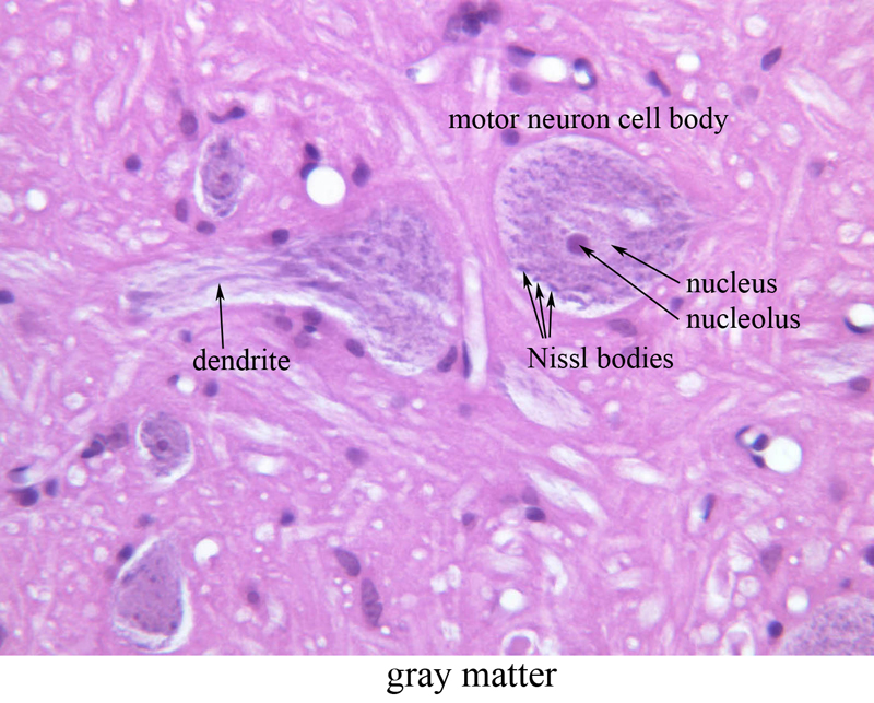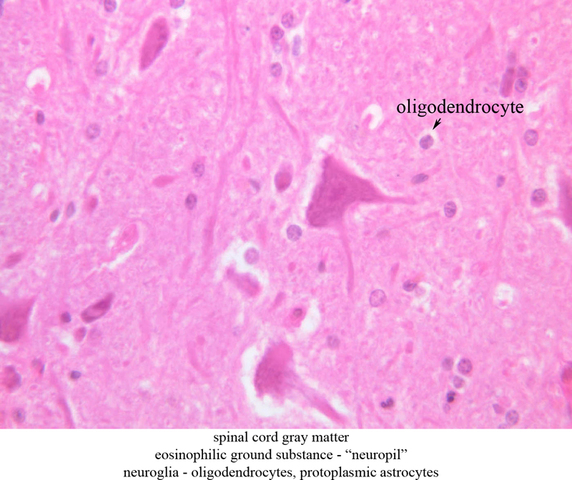 grey matter contains numerous large neurons and the eosinophilic ground substance is the