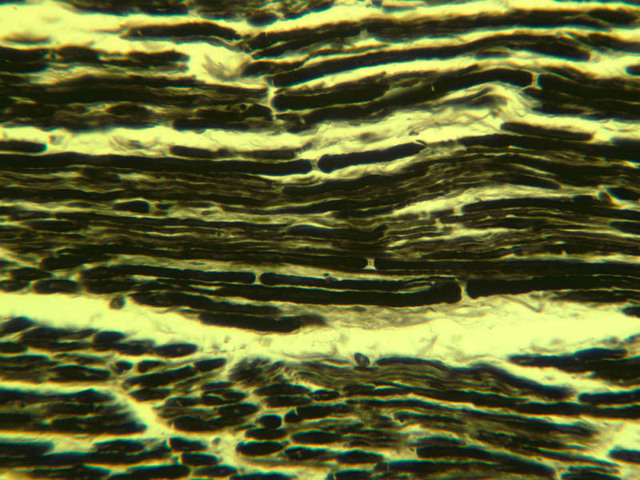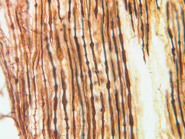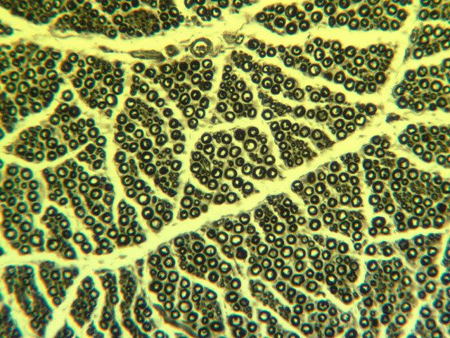 fascicles. Most axons within a nerve are myelinated. In longitudinal sections, the myelin