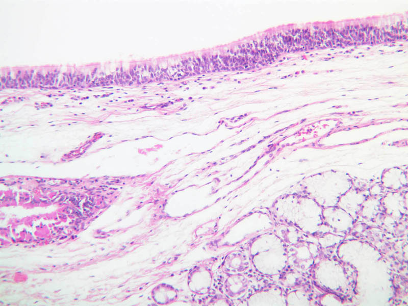 40x]. Find the elastic cartilage forming the core of the epiglottis. (Even though this slide is stained only with H&E, by adjusting the condenser of your microscope you should be able to distinguish the refractile elastic fibers that permeate the cartilage.) You should also be able to find lymphatic tissue and mixed glands in the lamina propria (A-67 [