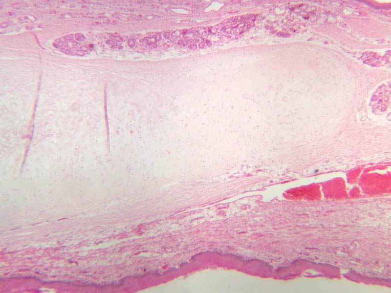 40x]. Note that the oral surface of the lip is covered by a very thick stratified squamous epithelium. Over the vermilion border (in life, the reddish portion) of the lip the stratified squamous epithelium is thinner and its outer layers are keratinized. This stratified squamous keratinized epithelium continues onto the outer surface of the lip, where sweat glands and hair follicles with their associated sebaceous glands appear in the underlying connective tissue bed. Note the abrupt change in epithelial thickness at the junction between the vermillion border and the oral mucosa; note also that this change in epithelial thickness pretty much coincides with a transition from keratinized to parakeratinized to nonkeratinized superficial layers. Look at your own lip and try to correlate what you see in the slide with what you see in the mirror.