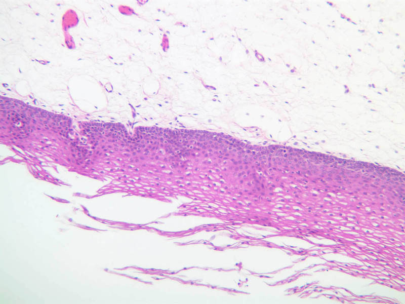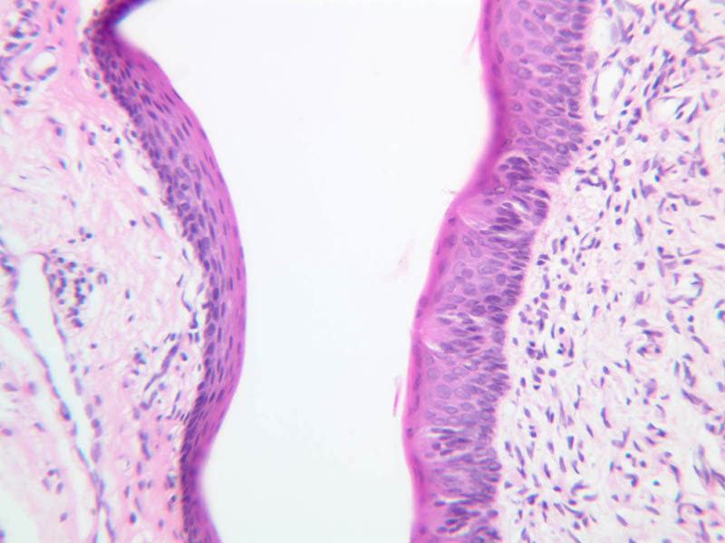 Using the lowest power objective, scan the section of human lip on slide A-55 [