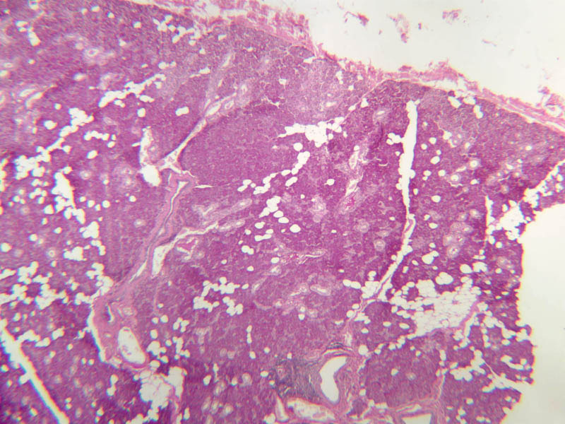 40x]). On low magnification, you can see lobes and lobules of serous acini (or alveoli). Note that the pyramidal cells of the acinus have a spherical, euchromatic nucleus and a markedly granular, well-stained cytoplasm. RER (ergastoplasm) is concentrated in the basal portion and membrane-bound secretory (zymogen) granules in the apical portion of the cells; accordingly, the basal cytoplasm is basophilic and the apical cytoplasm is acidophilic. These features are characteristic of serous cells, of which the human parotid gland is almost exclusively composed. Observe the acinar structure of the parotid gland closely and note that each circlet of epithelial tissue is invested by a basement membrane. Between this basement membrane and the round nuclei of the pyramidal glandular cells themselves, look for the flattened nuclei or eosinophilic processes of myoepithelial cells. Contraction of the processes of these cells expresses the secretory product. The parotid gland contains occasional aggregates of adipocytes, which bear a superficial resemblance to mucous secretory cells. You should be able to persuade yourself that these cells with large unstained vacuoles are not mucous cells by examining the PAS-stained section of parotid gland on slide
