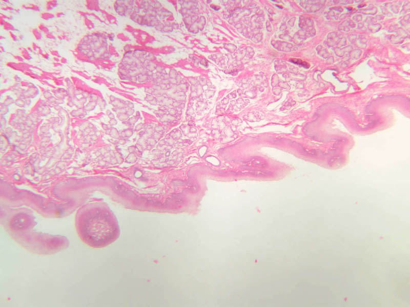 Using the lowest power objective, scan the section of human lip on slide A-55 [