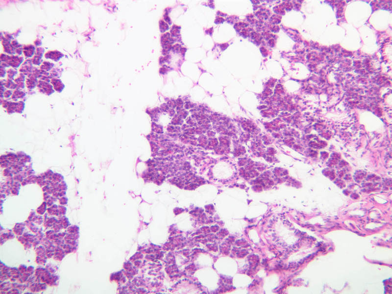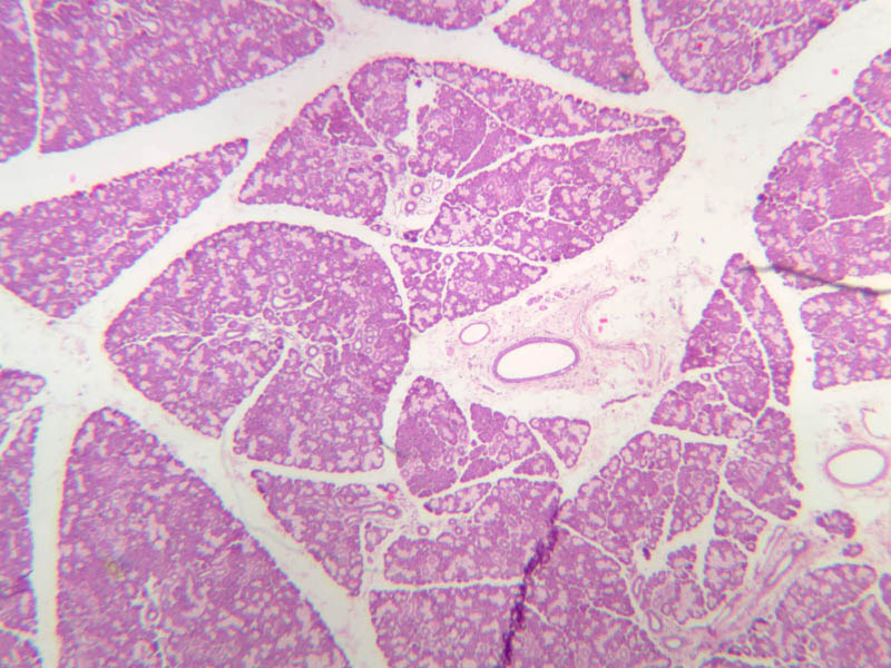 40x]). On low magnification, you can see lobes and lobules of serous acini (or alveoli). Note that the pyramidal cells of the acinus have a spherical, euchromatic nucleus and a markedly granular, well-stained cytoplasm. RER (ergastoplasm) is concentrated in the basal portion and membrane-bound secretory (zymogen) granules in the apical portion of the cells; accordingly, the basal cytoplasm is basophilic and the apical cytoplasm is acidophilic. These features are characteristic of serous cells, of which the human parotid gland is almost exclusively composed. Observe the acinar structure of the parotid gland closely and note that each circlet of epithelial tissue is invested by a basement membrane. Between this basement membrane and the round nuclei of the pyramidal glandular cells themselves, look for the flattened nuclei or eosinophilic processes of myoepithelial cells. Contraction of the processes of these cells expresses the secretory product. The parotid gland contains occasional aggregates of adipocytes, which bear a superficial resemblance to mucous secretory cells. You should be able to persuade yourself that these cells with large unstained vacuoles are not mucous cells by examining the PAS-stained section of parotid gland on slide