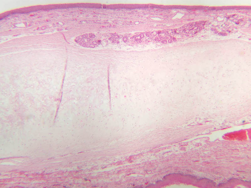 40x]. Find the elastic cartilage forming the core of the epiglottis. (Even though this slide is stained only with H&E, by adjusting the condenser of your microscope you should be able to distinguish the refractile elastic fibers that permeate the cartilage.) You should also be able to find lymphatic tissue and mixed glands in the lamina propria (A-67 [