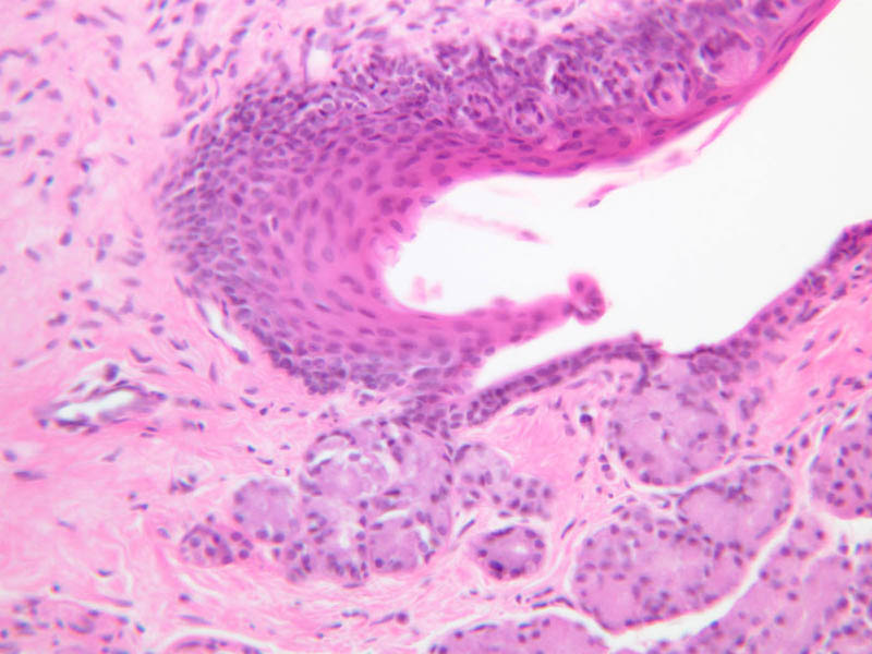 Using the lowest power objective, scan the section of human lip on slide A-55 [