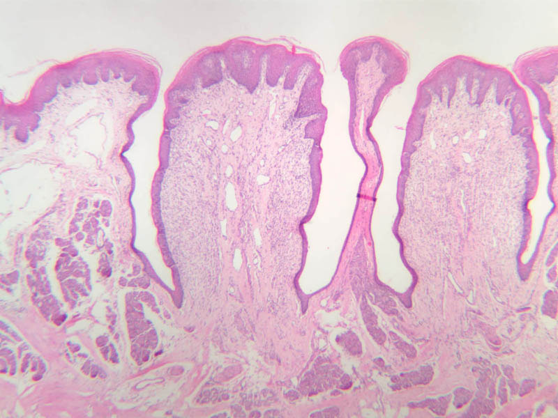 40x]), noting the elements of connective, muscular and glandular tissue that form its core and the very different epithelial coverage of its superior and inferior surfaces.