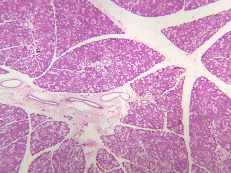 40x]). Note that this gland is divided into lobes and lobules by strands of connective tissue. The branches of connective tissue follow the divisions of the duct system from the oral cavity deep into the gland. As an aid to distinguishing ducts from secretory portions of the gland you should keep in mind that, even at low power, most duct elements are readily apparent because of their eosinophilic cytoplasm. Intercalated ducts, the initial segments of the duct system, are lined by low cuboidal cells and convey the secretory product from acini to striated ducts. Like the intercalated ducts, the striated ducts are intralobular; their simple epithelial lining ranges from cuboidal to high columnar and their eosinophilic cytoplasm is characterized by faint basal striations. These striations are the light microscopic manifestation of deep infoldings of plasma membrane associated with closely packed parallel arrays of mitochondria. This kind of structure is generally thought to subserve active ionic transport. Excretory (interlobular) ducts lie in the connective tissue between lobules. Depending on its caliber, the epithelial lining of an excretory duct may be simple cuboidal or columnar, stratified cuboidal or pseudostratified columnar.