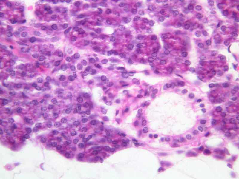 40x]). On low magnification, you can see lobes and lobules of serous acini (or alveoli). Note that the pyramidal cells of the acinus have a spherical, euchromatic nucleus and a markedly granular, well-stained cytoplasm. RER (ergastoplasm) is concentrated in the basal portion and membrane-bound secretory (zymogen) granules in the apical portion of the cells; accordingly, the basal cytoplasm is basophilic and the apical cytoplasm is acidophilic. These features are characteristic of serous cells, of which the human parotid gland is almost exclusively composed. Observe the acinar structure of the parotid gland closely and note that each circlet of epithelial tissue is invested by a basement membrane. Between this basement membrane and the round nuclei of the pyramidal glandular cells themselves, look for the flattened nuclei or eosinophilic processes of myoepithelial cells. Contraction of the processes of these cells expresses the secretory product. The parotid gland contains occasional aggregates of adipocytes, which bear a superficial resemblance to mucous secretory cells. You should be able to persuade yourself that these cells with large unstained vacuoles are not mucous cells by examining the PAS-stained section of parotid gland on slide