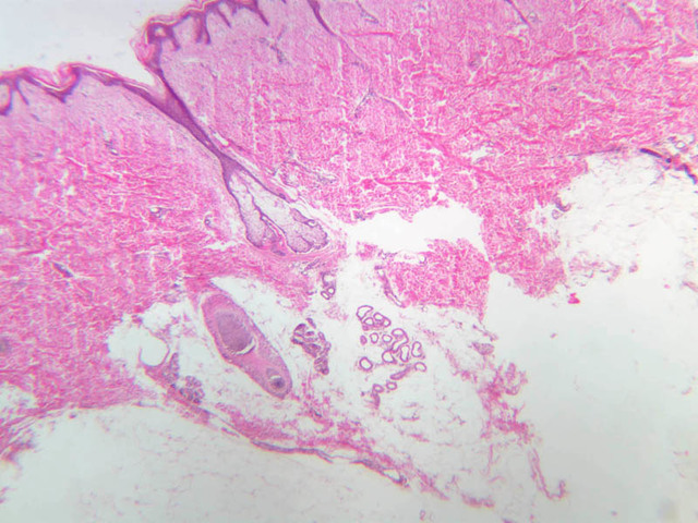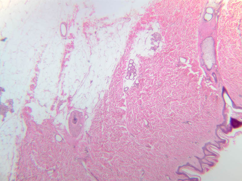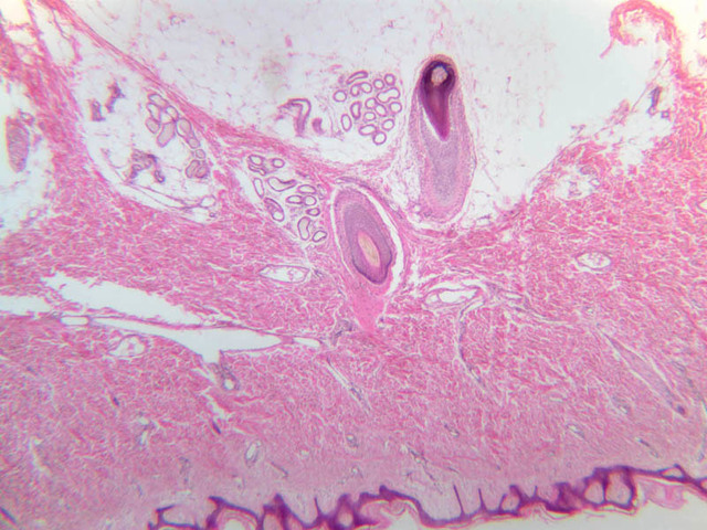 2 Hair Follicle HF H&E a48 abdominal skin 10x labeled.jpgA48, Abdominal Skin, 10x