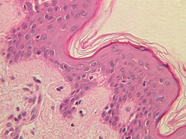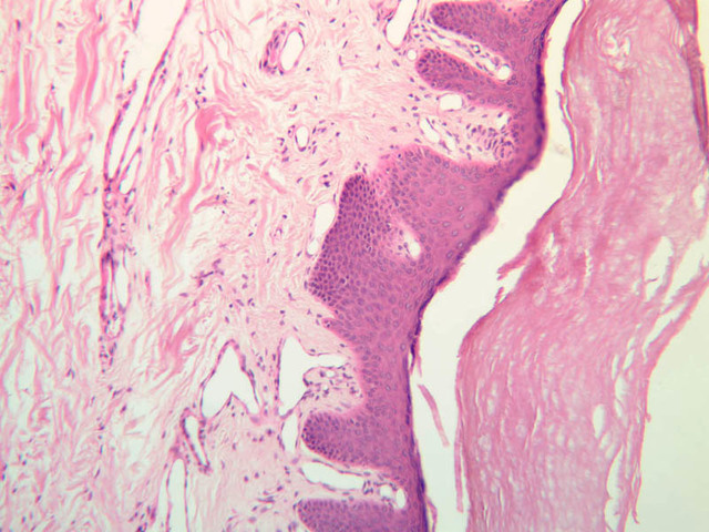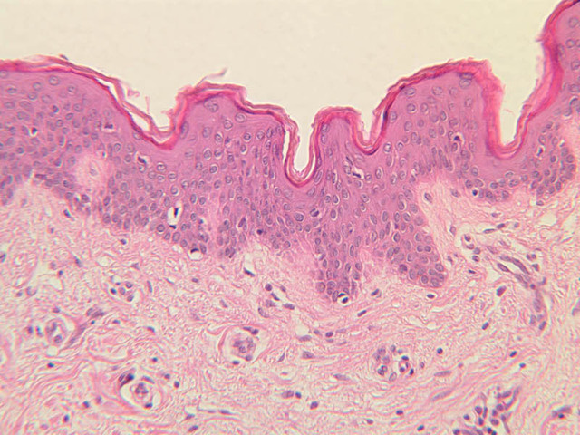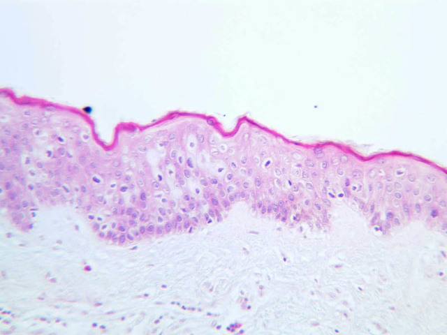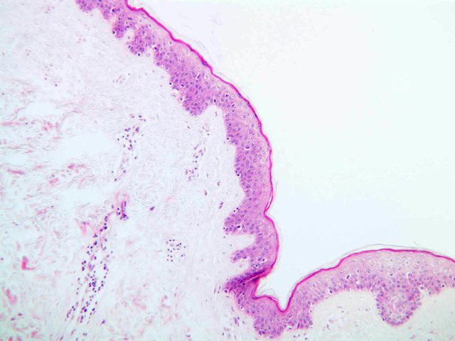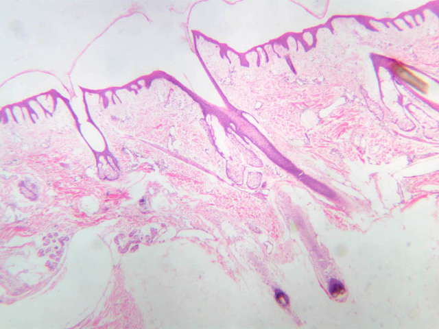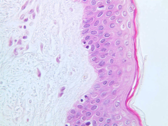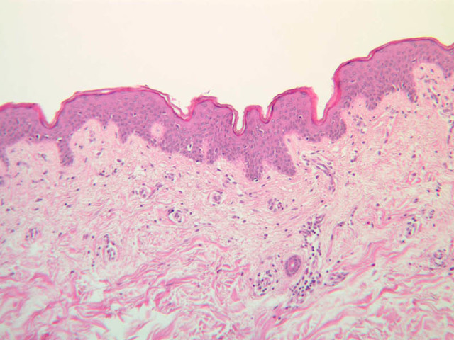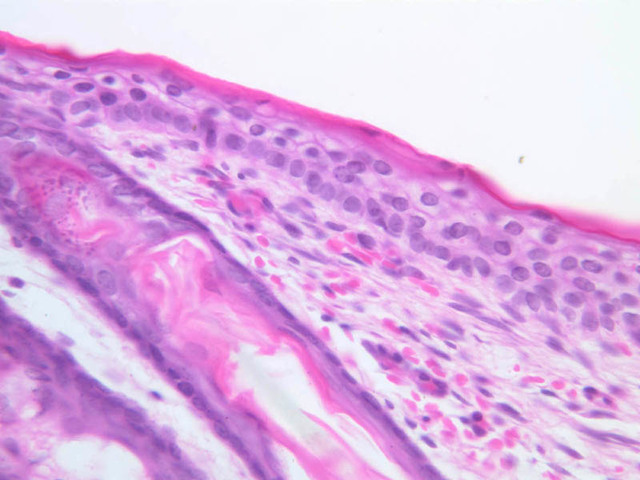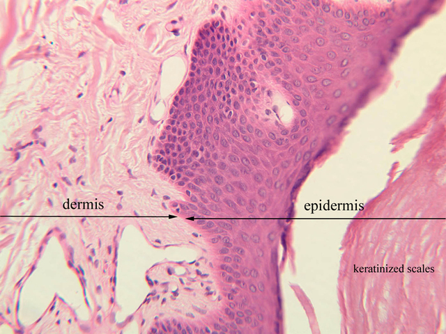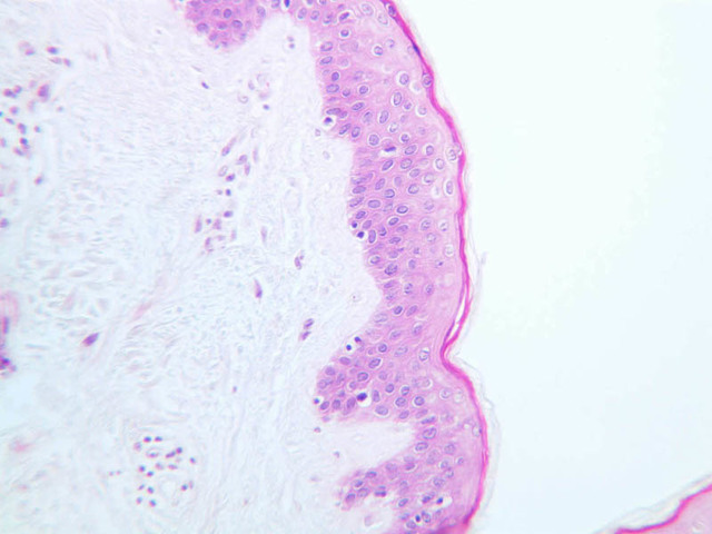 Observe thin skin (slide A-49 [2.5x, 10x, 20x, 40x]). All the epidermal layers in this skin are thin, the stratum lucidum is not apparent and the stratum corneum is especially thin. Skin is actually much more variable over the body surface than study of two samples might suggest, but thick and thin skin show the dramatic epidermal differences most commonly seen.