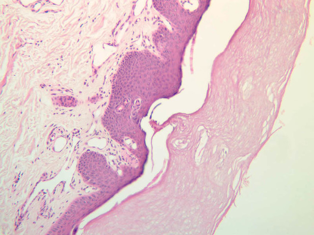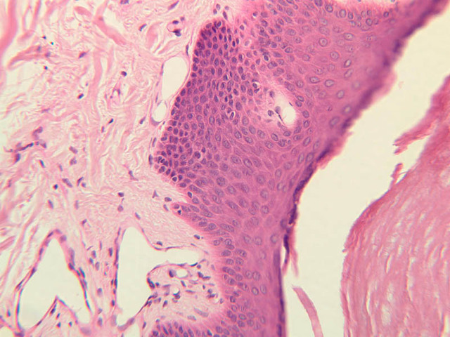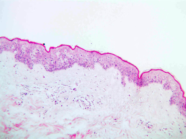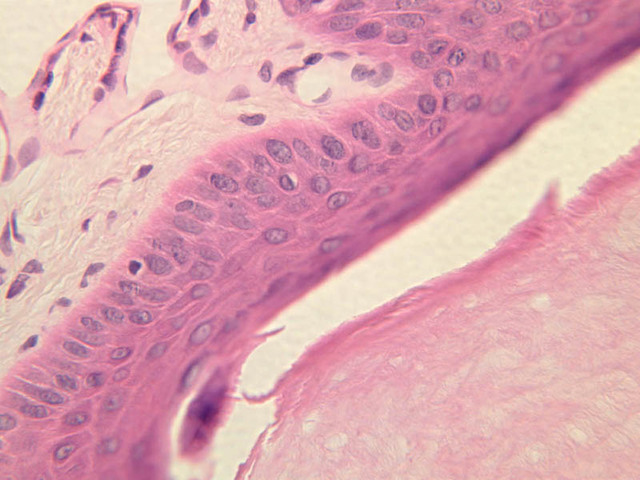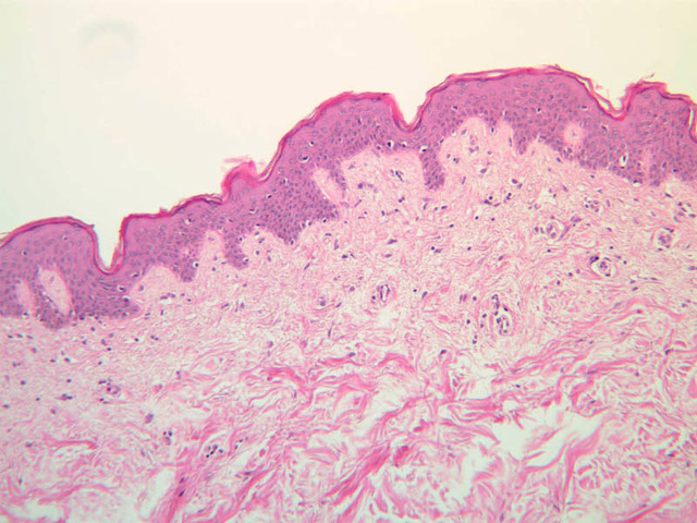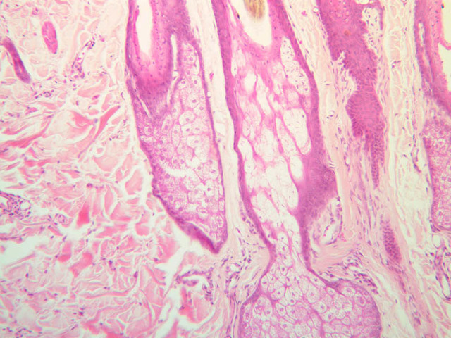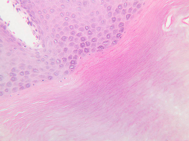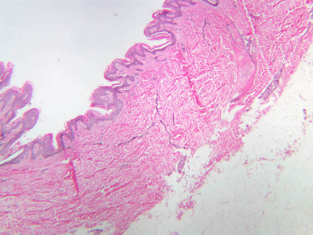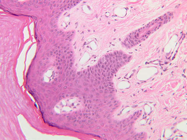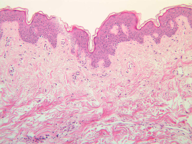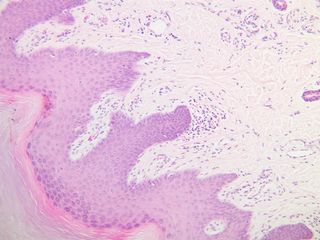 Observe thin skin (slide A-49 [2.5x, 10x, 20x, 40x]). All the epidermal layers in this skin are thin, the stratum lucidum is not apparent and the stratum corneum is especially thin. Skin is actually much more variable over the body surface than study of two samples might suggest, but thick and thin skin show the dramatic epidermal differences most commonly seen.