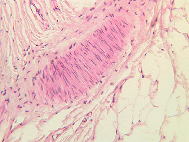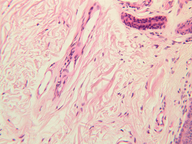 The dermis (glands, nerves, blood vessels, collagen, elastic fibers, ground substance-hyaluronic acid and mucopolysaccharides, fibroblasts, macrophages) of the skin is composed of connective tissue beneath the epidermis, and can be divided into two parts, a papillary layer and a reticular layer (A-48 [2.5x, 10x-labeled, 10x]). The papillary layer is the more superficial of the two; it projects up into the epidermis. The boundary between the papillary layer and the reticular layer is not distinct. Examine and compare the dermis in slides A-48 ([2.5x, 10x, 20x, 40x-labeled] [10x-labeled]) and A-50 ([2.5x, 10x, 20x]). Locate glands, nerves, blood vessels, collagen, elastic fibers, ground substance, fibroblasts, and macrophages. The fibers in the papillary layer are much finer than in the reticular layer, where their cross-lacing produces the network from which the name is derived.