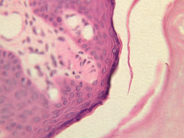 The stratum lucidum is often considered to be a subdivision of the stratum corneum. This layer is evident only in thick (glaborous) skin. It appears as a clear band beneath the stratum corneum. Cells of the stratum lucidum are well advanced in the process of keratinization. Consequently, the nucleus and many of the cytoplasmic organelles become disrupted and disappear as the cells become filled with the intracellular protein keratin. In many specimens, there is a separation artifact at this point. The outermost layer of the epidermis is called the stratum corneum and is composed of fully cornified (keratinized) remnants of epithelial cells ([40x]). It has a basketweave appearance. The close union of the resulting scales with each other, and their content of insoluble protein and extracellular lipids, provides a barrier to diffusion between the body and its external environment.