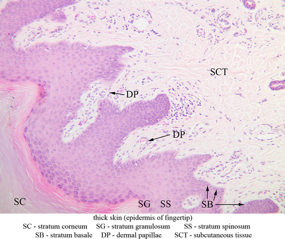 11 Stratum Granulosum SG H&E a50 thick skin 10x labeled.jpgA50, Fingertip, 10x