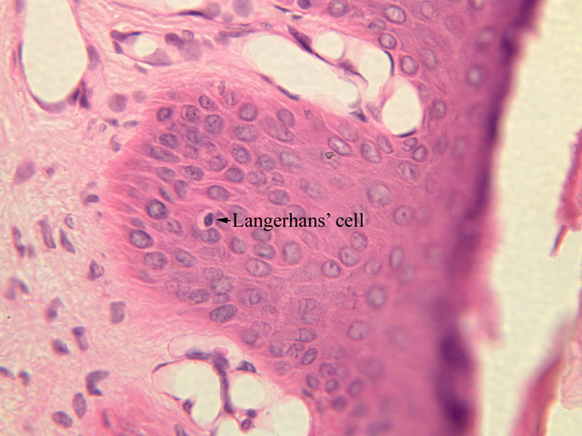 8 Langerhans' Cell (arrow) H&E a48b dark skin 40x labeled.jpgA48, Abdominal Skin, 40x