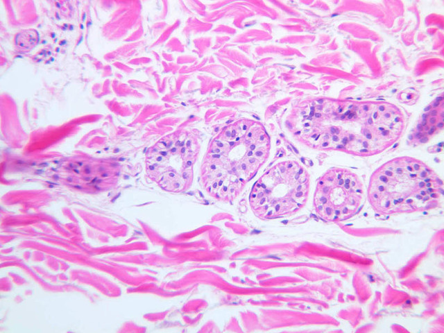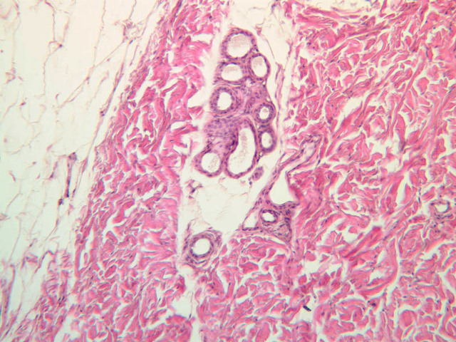 4 Capillary C H&E a48b gland abdominal skin 40x labeled.jpgA48, Abdominal Skin, 40x