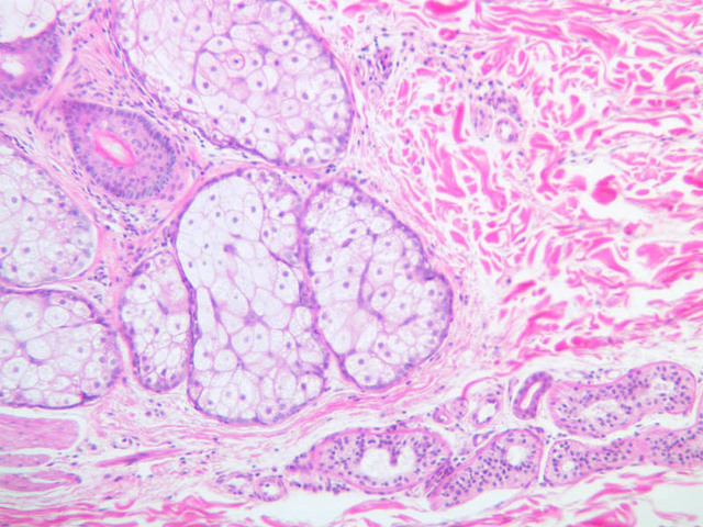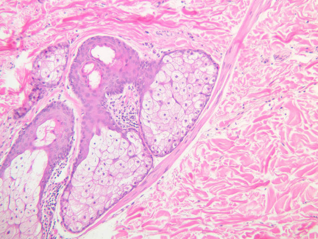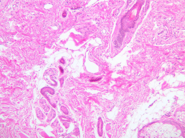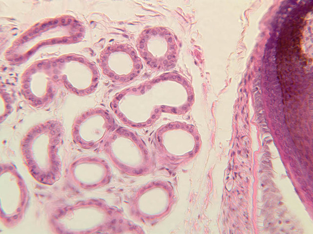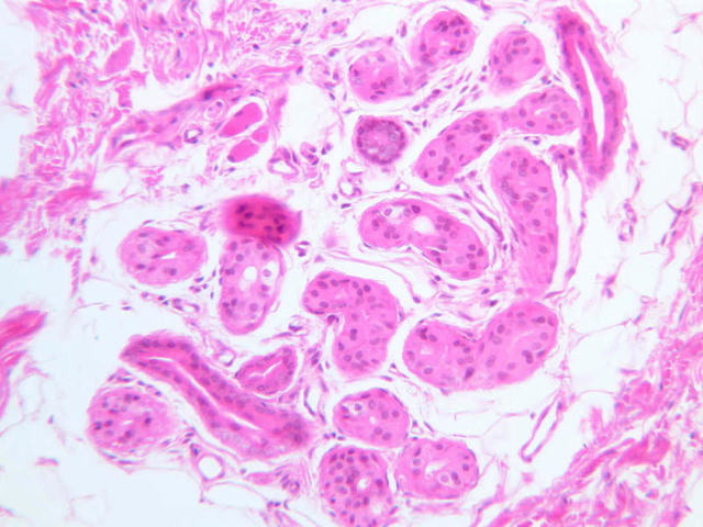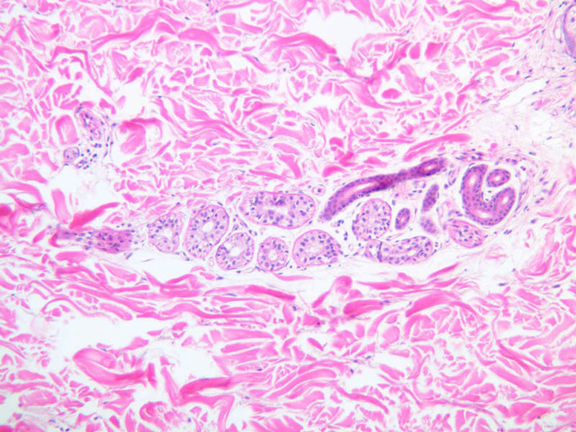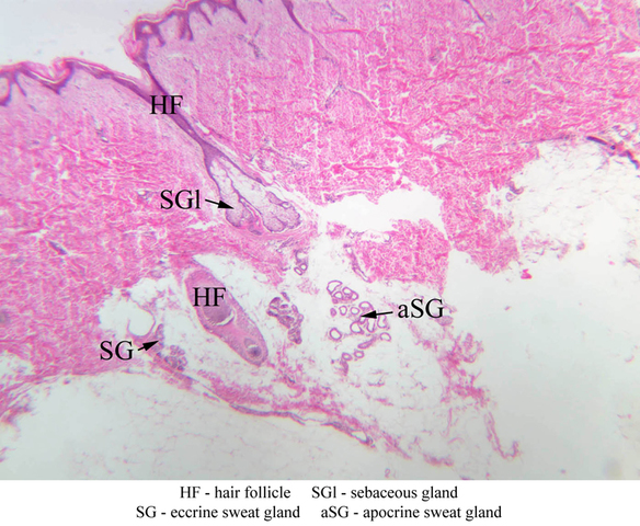 2 Sebaceous Gland SGl H&E a58 sweat glands 2x labeled.jpgA58, Axilla, 2.5x