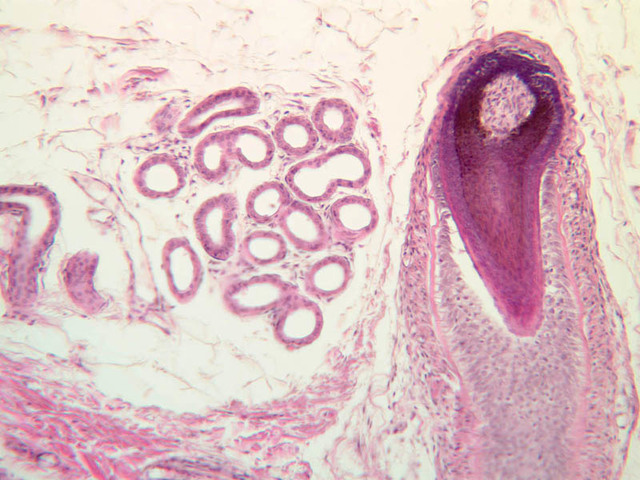 5 Sebaceous Gland Seb H&E a49b hair scalp 20x labeled.jpgA49, Scalp, 20x