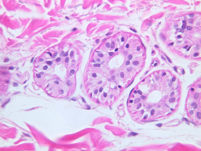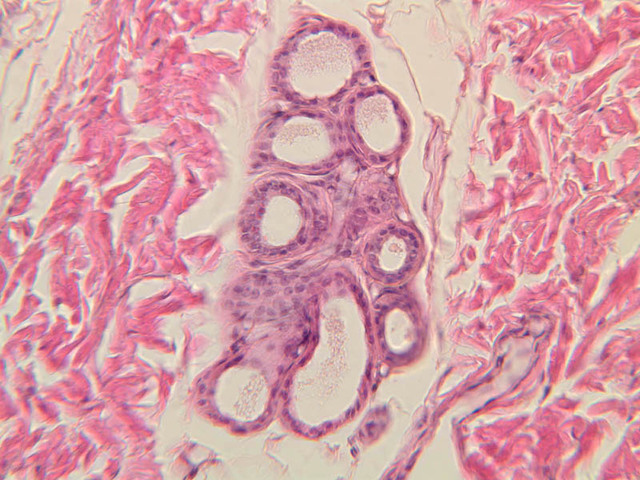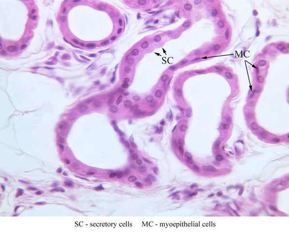 3 Myoepithelial Cell MC H&E a48b gland abdominal skin 40x labeled.jpgA48, Abdominal Skin, 40x