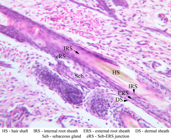6 Sebaceous-ERS Junction eRS H&E a49b hair scalp 20x labeled.jpgA49, Scalp, 20x