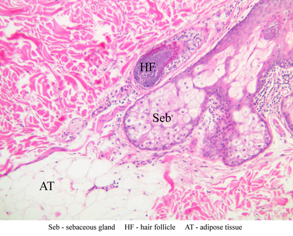 1 Sebaceous Gland Seb H&E a48 abdominal skin 10x labeled.jpgA48, Abdominal Skin, 10x