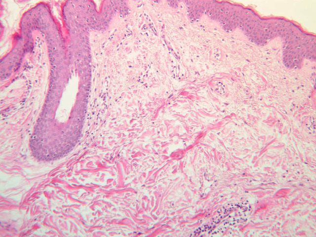 7 Collagen (arrow) H&E a48 reticular layer 10x labeled.jpgA48, Abdominal Skin, 10x
