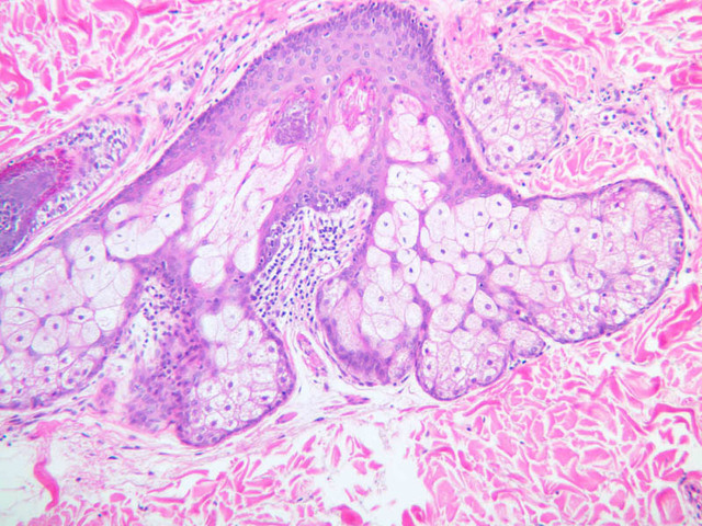 These glands are branched, saccular glands generally associated with hair follicles (slide A-48, abdomen [2.5x, 10x-labeled, 20x, 40x] [2.5x, 10x, 20x, 40x] [2.5x, 20x, 40x]). They can be seen on the skin side of the lip (slide A-55 [2.5x, 10x]) and in the scalp (A-52 [2.5x, 10x]; A-59 [10x] [2.5x, 10x]). The gland consists of a shell of viable epithelial cells externally which gradually undergo fatty degeneration as they are pushed into the interior of the gland. They finally disintegrate completely and form the fatty substance that makes up sebum. This material leaves the gland through its neck which attaches to a hair follicle.