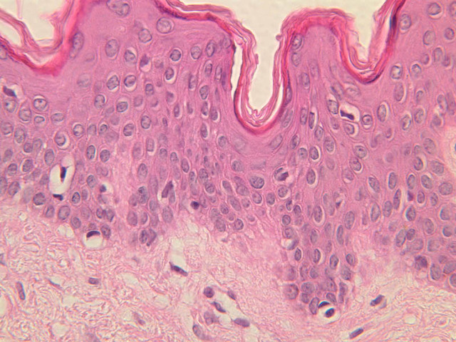 Merkel cells may also be found in the basal layer of the epidermis. These cells are more common in fingertip and lip, and are believed to function as mechanoreceptors to detect pressure. Merkel cells, which are lightly stained by H&E, may be difficult to distinguish from melanocytes without immunostaining. Merkel cells are best visualized by electron microscopy.