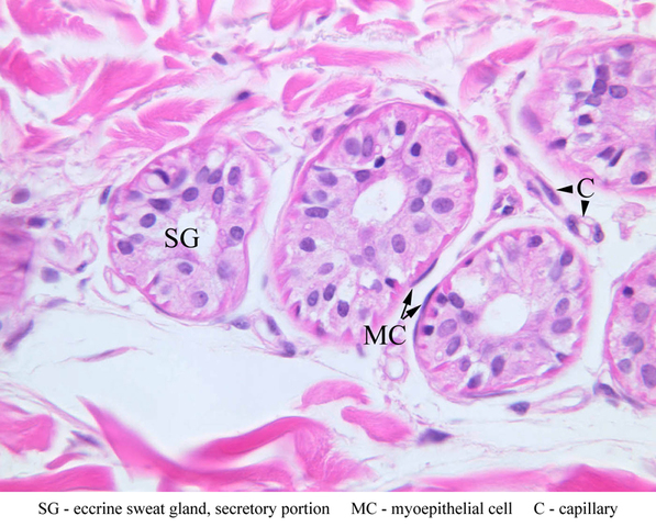 The secretory portion of the gland is located in the reticular layer of the dermis or in the subcutaneous tissue. The secretory cells are shaped like truncated pyramids, with their apical ends surrounding the lumen. Between the basement membrane and the secretory cells, the nuclei of myoepithelial cells can be seen. By their contraction, these cells help to empty the gland of secretions. Their ducts become coiled as they travel through the dermis. The ducts are composed of a double layer of epithelial cells that usually appear to be more intensely stained than the secretory cells.